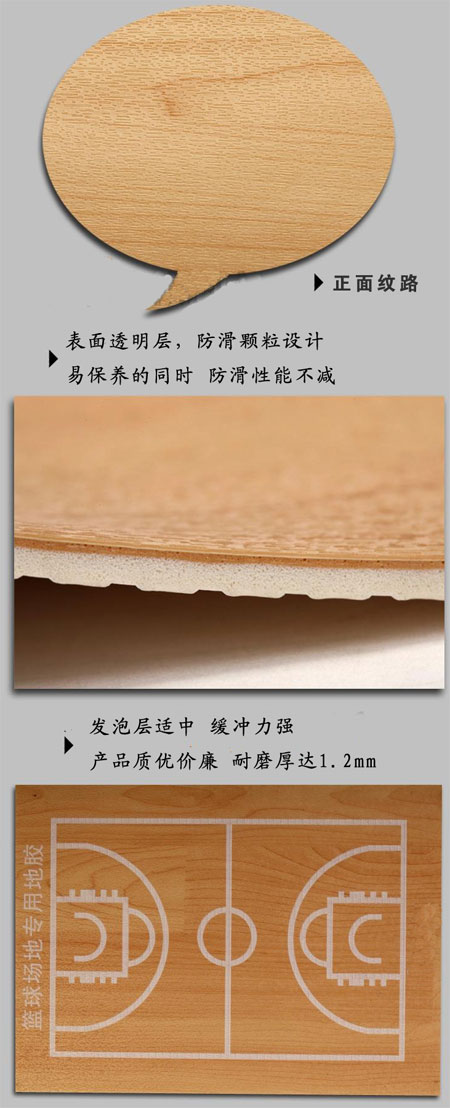 楓木PVC運動地板是仿楓木地板紋路開發(fā)的一款產(chǎn)品,專門為籃球場地面而設(shè),鋪裝使用與實木楓木地板無明顯差別,但在價格上更勝一籌,表面采用透明層處理,清潔非常方便,楓木紋發(fā)泡均勻、厚度適中,可以有效減少運動跌倒對運動員的傷害。而健身房使用此款地板,簡介大方,由于呈淺色設(shè)計,可使光線發(fā)射達(dá)到最大效果,在空間方面得到視覺加強。