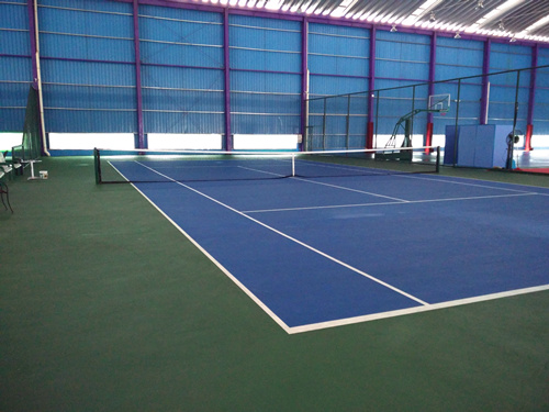 該項目選用優質丙烯酸面層施工2片丙烯酸網球場;環保水性硅PU施工2片塑膠籃球場,采用絕對環保材料,保證了室內場地凈味無毒害氣體發揮;采用實木楓木地板鋪設了2片標準木地板籃球場,另外14片羽毛球場采用PVC地膠鋪設。